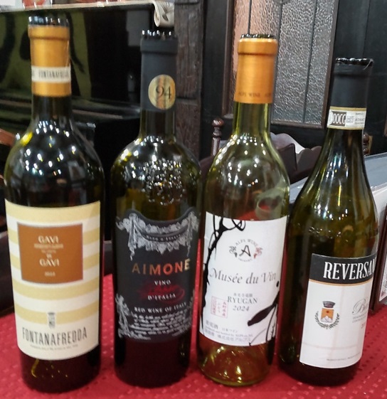 飲んだワインは左から、Gavi de Gavi 白 イタリア、Aimone Vino Rosso  赤 イタリア、Musée du Vin Ryugan 白 日本、Reversanti Barolo 赤 イタリアの4本。