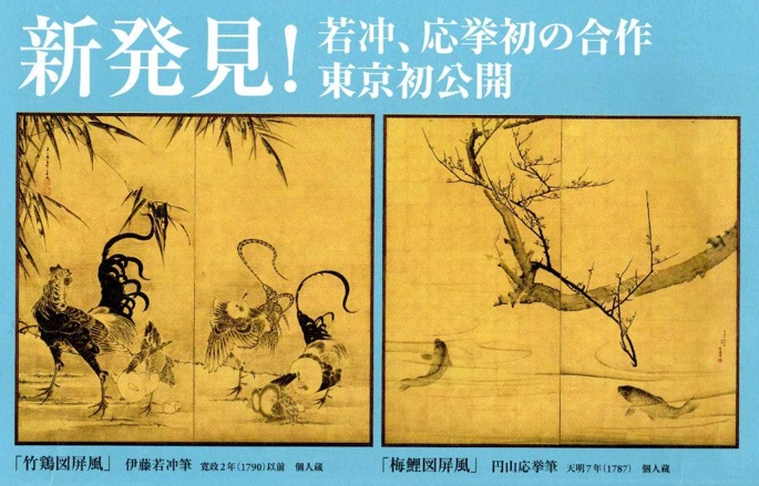 江戸時代末期、同じ京都の近くに住みながら、今迄、応挙と若冲の交流は見つかりませんでした。今回初めて合作屏風が見つかったのです。東京初公開です。