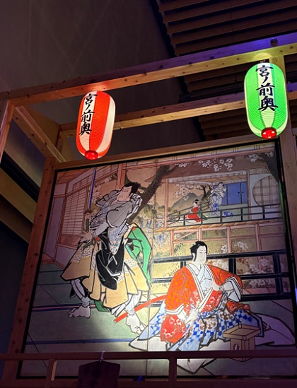 「伊達競阿国劇場(だてくらべおくにかぶき)」を背景に、絵金展入口で