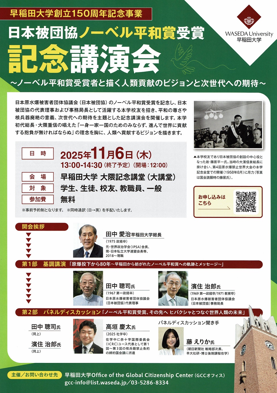 早稲田大学は、創立150周年記念事業の一環として「日本被団協ノーベル平和賞受賞記念講演会」を次の要領で開催します。