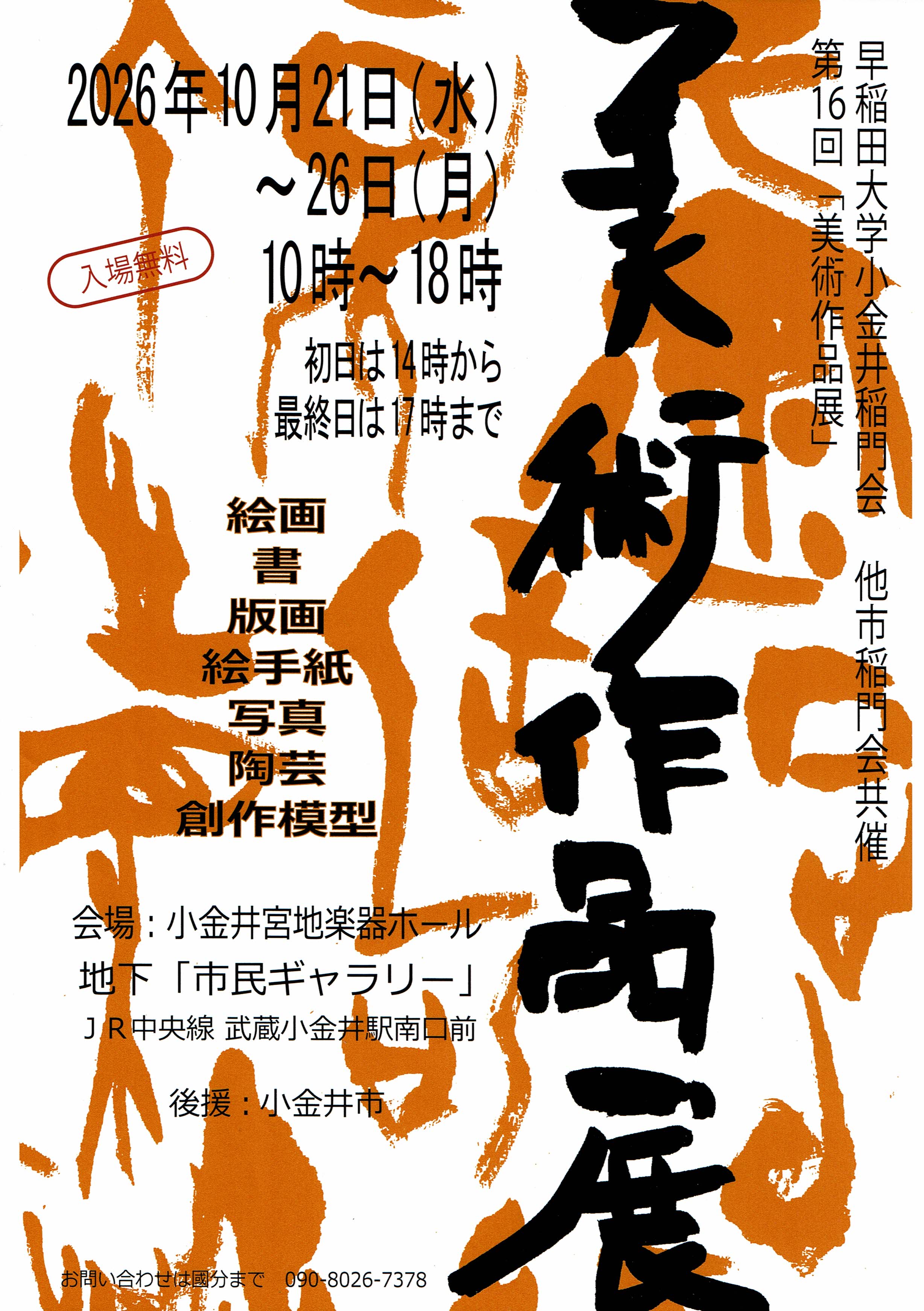 小金井稲門会の第16回美術作品展が2026年10月に開かれますが、近隣稲門会の会員にも出展してほしいとして、広く作品を募集しています。