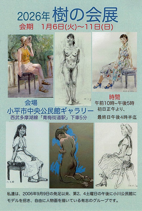 2006年に発足した、人物画を描く有志グループの作品展「樹の会展」が次の要領で開かれます。小平稲門会会員の芦野信司さん(1979文)が出品します。