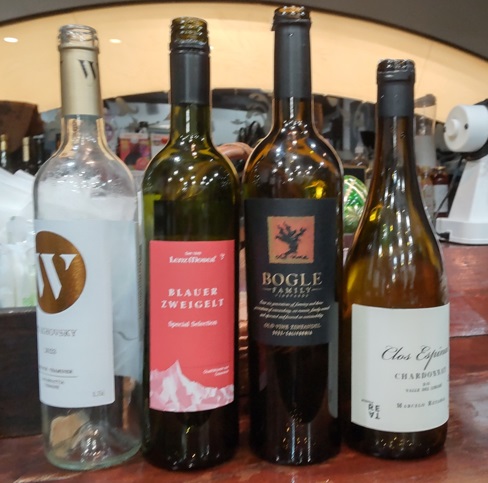 左から、STAKHOVSKY オレンジ ウクライナ、Lenz Moser Blauer Zweigelt 赤 オーストリア、Bogle Vineyards Old Vine 赤 アメリカ、Reta Clos Espinal 白 チリ。