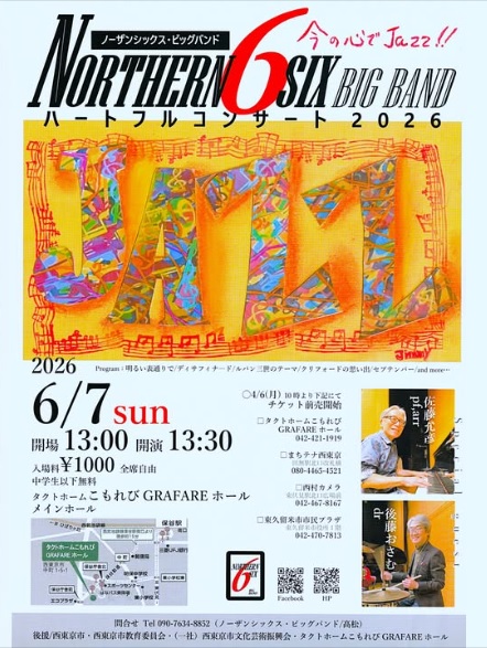 Northern 6 Big Bandの「ハートフルコンサート2026」は、次の要領で開催されます。小平稲門会顧問の石井道彌さん(1952文)がピアニストとして出演します。