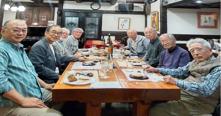 会はいつものように談論風発、40代でヒマラヤの4,000メートル級の山に挑戦された経験を持つ大ベテランは日本の登山ではグイグイ登り、若い仲間がねを挙げるほどだったそうです。1世紀を生き抜く驚異的な体力知力の持ち主で話題も豊富、いつも会が盛り上がります。建築学科出身の方は東京文化会館や東京都美術館を設計したり、ル・コルビュジエの弟子として国立西洋美術館の設計にも関与した建築家前川國男について解説したりしていただきました。旧前川邸は小金井公園の江戸東京たてもの園に移設・展示してあるそうです。ワイン研究会の会場「こもれび」は古民家の解体で出た古木で梁が造られており、テーブルもまた厚い1枚板で贅沢な空間、ワインを飲んでワイワイガヤガヤするにはもったいないくらいな空間です。