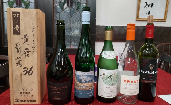 飲んだワイン(ボトル)は左から、CORDILLERA EXTRA BRUT チリ スパークリング、RHEINGAU VOLRATZ ドイツ 白、北の雫 日本 貴腐ワイン、CRAMELE RECAS SA ORANGE NATURAL ルーマニア オレンジ、MOUTON CADET フランス 赤-の5本。